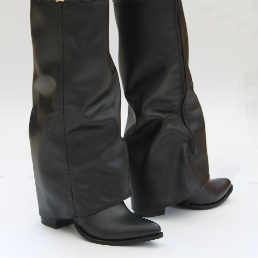 Esta bota lo tiene todo: diseño, detalles y personalidad. La capa superior le da volumen y movimiento, mientras que la puntera definida y la correa decorativa aportan estructura y un estilo sofisticado. La cremallera lateral facilita el calce sin sacrificar estética, haciendo de esta bota una pieza clave para un look fuerte y moderno.